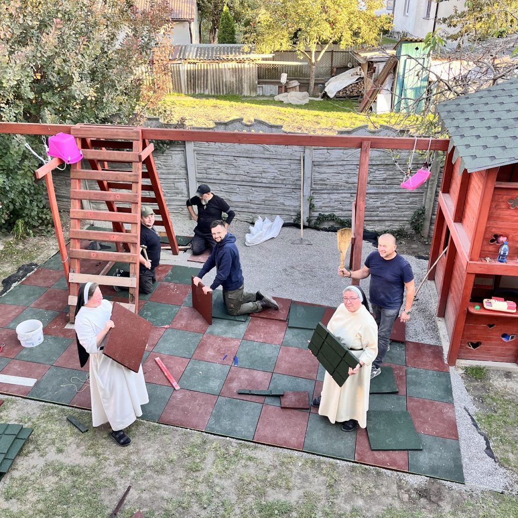 W czasie wyprawy wykonaliśmy również prace przy placu zabaw przy polskiej szkole sióstr dominikanek w Czortkowie. Przewieźliśmy i ułożyliśmy 90 worków tłucznia, tworząc blisko 40 m² nowego podłoża.